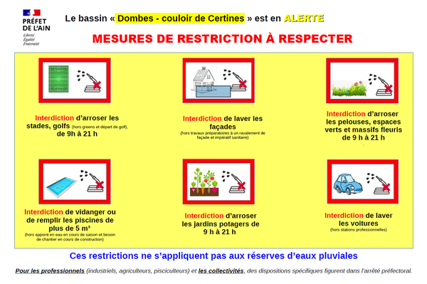 Compte-tenu d'un démarrage météorologique sec et chaud de la saison printanière associé à une pluviométrie absente depuis le début de l'année et des précipitations prévues faibles et peu fréquentes, le Préfet de l'Ain a également placé la nappe phréatique de la Plaine de l'AIn en situation de Vigilance Sécheresse. Ainsi, les habitants et professionnels des communes de la Mairie de Chatillon la Palud et de Villette sur Ain sont désormais invités, sans y être contraints, à suivre les restrictions (ci-dessous), par ailleurs imposées sur le secteur du bassin Dombes Certines de gestion des eaux souterraines dont le statut d'Alerte est toujours prolongé.