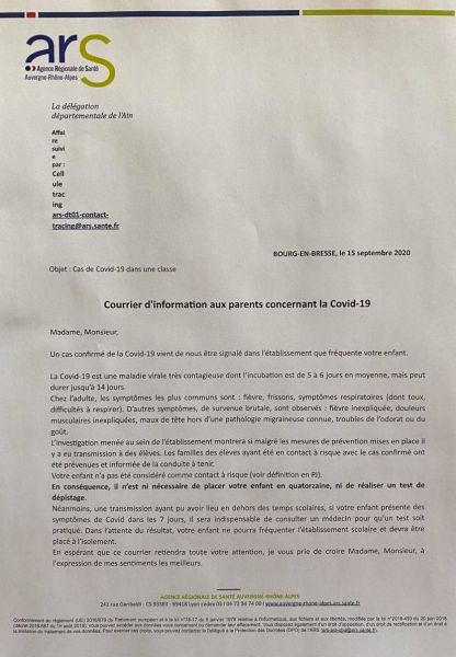- Courrier envoyé aux familles des enfants déclarés cas contact ARS : ceux-ci doivent s’isoler