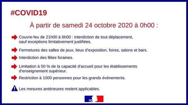 À compter de samedi 24 octobre à 0h00 (soit dans la nuit de vendredi à samedi), de nouvelles mesures seront en vigueur pour 3 semaines.